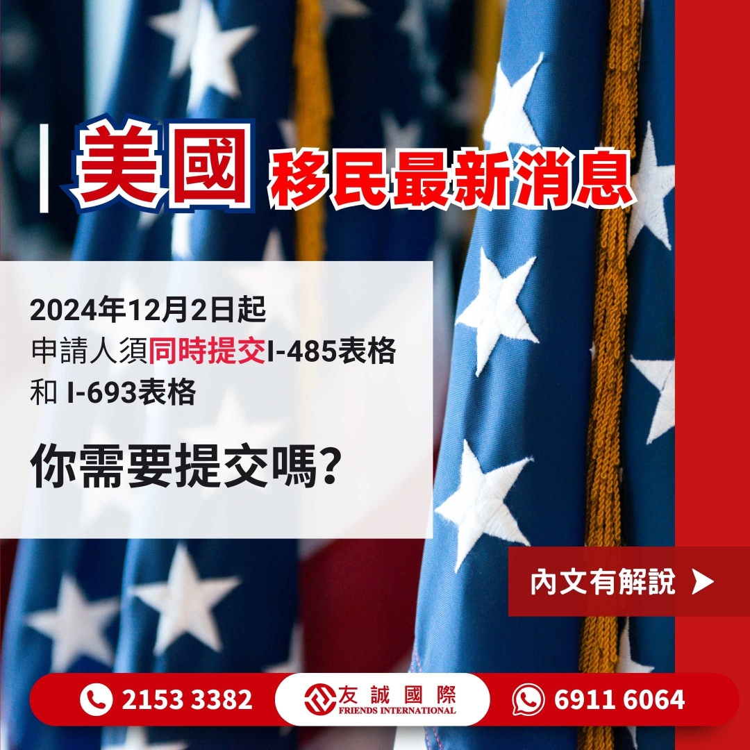 美國移民局12月2日發佈新政策,即日起,要求申請人提交I-485 表格的時候,必須將其與I-693 表格一起提交,否則 I-485 表格會被拒收。