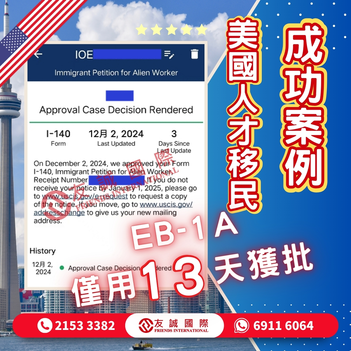 恭喜K先生美国EB1-A仅用13天申请成功!